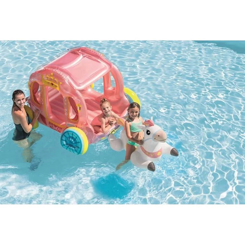 Facile à gonfler et à installer, ce carrosse pourra être utilisé dans l’eau (piscine, mer, lac…), mais également dans votre jardin, sur la terrasse, ou même à l’intérieur de votre maison.
