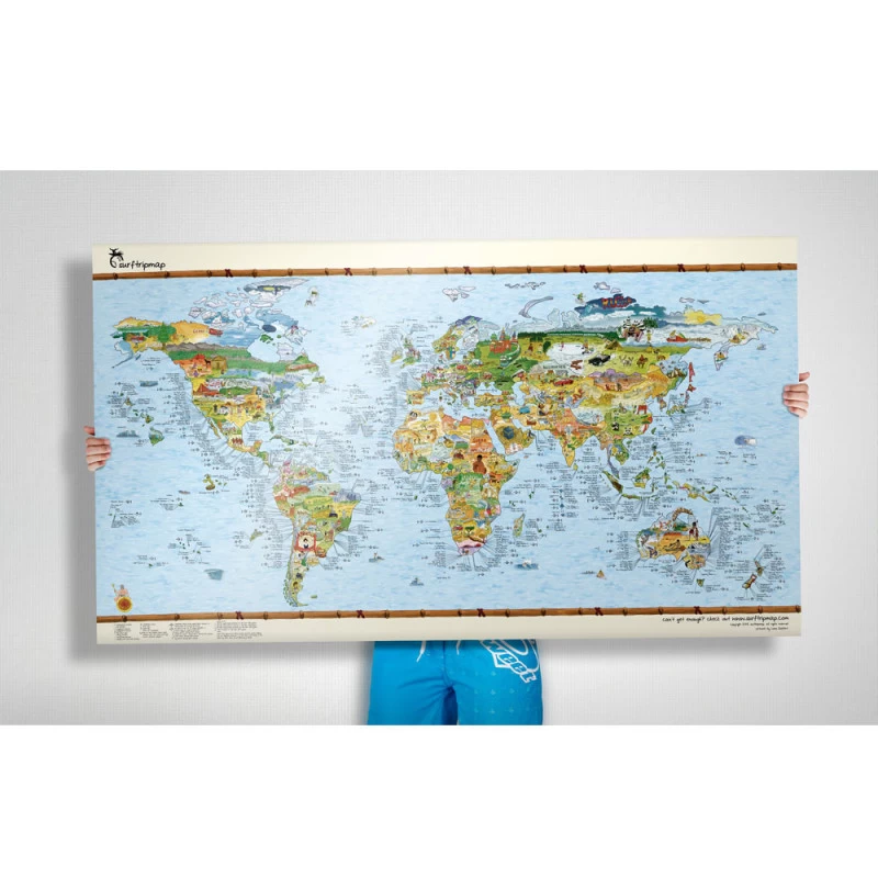 Poster grand format (96cm) reprĂ©sentant sous forme d’illustrations une carte du monde avec plus de 1000 spots de surf recensĂ©s.